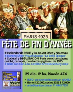 Los esperamos a la visita guiada de la colección Art Nouveau de originales, artes decorativas y objetos de época, en nuestro Micro Museo y al CINEMA EXP 4 con un show audiovisual en pantalla curva de 3 metros. Bono contribución, que incluye una copa de champagne y obsequio Art Nouveau . Reserva previa al 4943 7251 o arte@aanba.com.ar