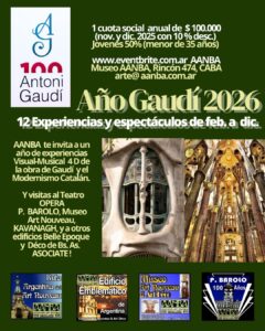 CICLO GAUDÍ 2026 Centenario de su paso a la Inmortalidad: 5 eventos y espectáculos a saber: 3 Experiencias Sensoriales- musicales con degustación, entrando a sus más famosos edificaciones: uno en la Sagrada Familia, otro en 3 edificios y el último con sus 4 edificios señeros. En proyección H4D en pantalla curva de 3 mts, música impresionista en 6 canales, espectáculo guiado por Horacio Elgorriaga, el especialista en Modernismo Catalán. Otra gala de época, en el elaborado Casal de CATALUNYA de San Telmo, recorriendolo guiado por completo, con charla audiovisual de las edificaciones Art Nouveau con impronta del Modernismos Catalán en Argentia. la última gala será un estreno «El Modernismo de Valencia y Barcelona» en el Museo Art Nouveau AANBA con una excelente EXPO de Artes Decorativas originales de la época. Y degustación catalana!